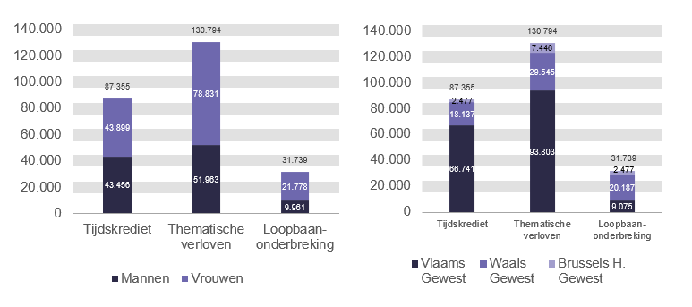 Vooral vrouwen nemen tijdskrediet, thematisch verlof of loopbaanonderbreking. In augustus 2025 ging het om 144.508 vrouwelijke uitkeringstrekkers (57,8%) tegenover 105.380 mannelijke (42,2%). Verder wordt vooral in het Vlaams Gewest gebruik gemaakt van tijdskrediet, thematische verloven en loopbaanonderbreking: in augustus 2025 gaat het om 169.619 uitkeringstrekkers (67,9%) tegenover 67.869 in het Waals en 12.400 in het Brussels Hoofdstedelijk Gewest (respectievelijk 27,2% en 5,0%).