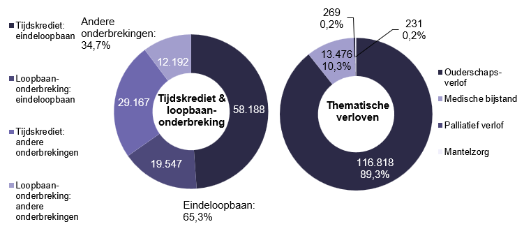 Bijna 2/3 van de uitkeringen in het kader van tijdskrediet en loopbaanonderbreking (77.735 eenheden, d.i. 65,3%) betreffen het eindeloopbaanstelsel, waarmee oudere werknemers vóór hun pensioen hun werkregime lichter maken teneinde langer tewerkgesteld te kunnen blijven. De thematische verloven betreffen voor ongeveer 9/10 het ouderschapsverlof (116.818 eenheden, d.i. 89,3%).