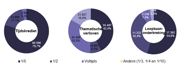Het aantal voltijdse onderbrekingen is daarentegen vrij beperkt: het gaat om 47.551 of 19,0% van de gevallen (2.856 of 3,3% bij het tijdskrediet, 42.459 of 32,5% bij de thematische verloven en 2.236 of 7,0% bij de loopbaanonderbreking).