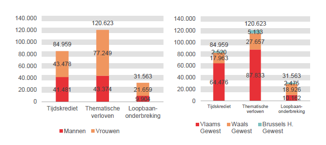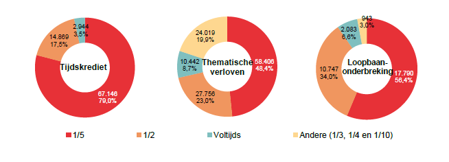 Het aantal voltijdse onderbrekingen is daarentegen vrij beperkt: het gaat om 15.469 of 6,5% van de gevallen (2.944 of 3,5% bij het tijdskrediet, 10.442 of 8,7% bij de thematische verloven en 2.083 of 6,6% bij de loopbaanonderbreking).