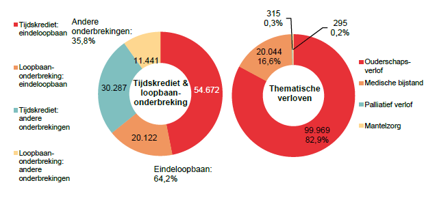 Bijna 2/3 van de uitkeringen in het kader van tijdskrediet en loopbaanonderbreking (74.794 eenheden, d.i. 64,2%) betreffen het eindeloopbaanstelsel, waarmee oudere werknemers vóór hun pensioen hun werkregime lichter maken teneinde langer tewerkgesteld te kunnen blijven. De thematische verloven betreffen voor meer dan 4/5 het ouderschapsverlof (99.969 eenheden, d.i. 82,9%).