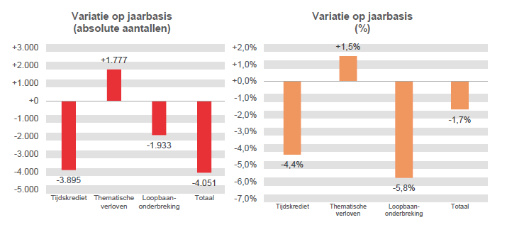 Dalingen bij het tijdskrediet en de loopbaanonderbreking, stijging bij de thematische verloven