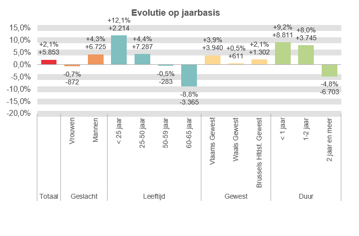 De volledige werkloosheid van korte duur (< 1 jaar) neemt toe op jaarbasis met 8.811 eenheden (+9,2%), net zoals die van 1 tot 2 jaar: +3.745 eenheden (+8,0%). De langdurige werkloosheid (2 jaar en meer) daalt met 6.703 eenheden (-4,8%).