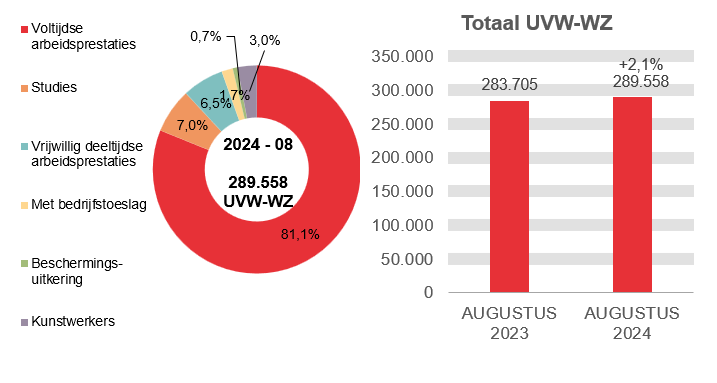 In augustus 2024 hebben 289.558 uitkeringsgerechtigde volledig werkloze werkzoekenden (UVW-WZ) een uitkering ontvangen, d.i. 5.853 meer dan in augustus 2023 (+2,1%). Zij worden als volgt verdeeld: 234.907 UVW-WZ toegelaten op basis van voltijdse arbeidsprestaties, 20.139 toegelaten op basis van studies, 18.694 UVW-WZ toegelaten op basis van vrijwillig deeltijdse arbeid, 5.031 UVW-WZ met bedrijfstoeslag, 2.141 beschermingsuitkeringen en 8.646 kunstwerkers.