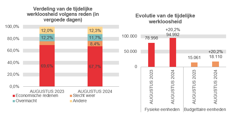 De tijdelijke werkloosheid ten slotte neemt op jaarbasis toe met 15.994 eenheden of 20,2%. Het aantal werknemers in tijdelijke werkloosheid komt in augustus 2024 op 94.992 fysieke eenheden, wat overeenkomt met 18.110 budgettaire eenheden rekening houdend met het beperkte aantal dagen van werkloosheid in de loop van de maand.