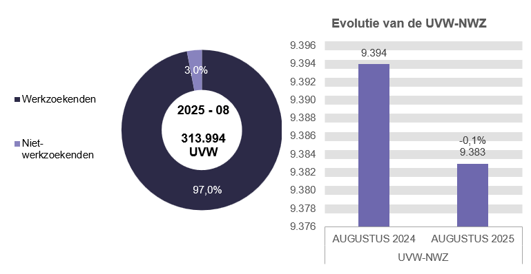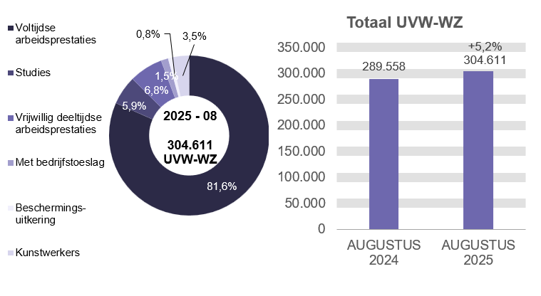 In augustus 2025 hebben 304.611 uitkeringsgerechtigde volledig werkloze werkzoekenden (UVW-WZ) een uitkering ontvangen, d.i. 15.053 meer dan in augustus 2024 (+5,2%). Zij worden als volgt verdeeld: 248.673 UVW-WZ toegelaten op basis van voltijdse arbeidsprestaties, 17.892 toegelaten op basis van studies, 20.664 UVW-WZ toegelaten op basis van vrijwillig deeltijdse arbeid, 4.430 UVW-WZ met bedrijfstoeslag, 2.418 beschermingsuitkeringen en 10.534 kunstwerkers.