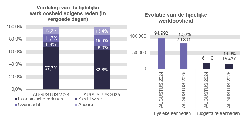 De tijdelijke werkloosheid ten slotte neemt op jaarbasis af met 15.191 eenheden of 16,0%. Het aantal werknemers in tijdelijke werkloosheid komt in augustus 2025 op 79.801 fysieke eenheden, wat overeenkomt met 15.437 budgettaire eenheden rekening houdend met het beperkte aantal dagen van werkloosheid in de loop van de maand.