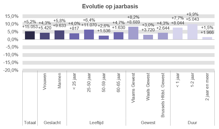 De volledige werkloosheid van korte duur (< 1 jaar) neemt toe op jaarbasis met 8.044 eenheden (+7,7%), net zoals die van 1 tot 2 jaar: +5.043 eenheden (+9,9%). De langdurige werkloosheid (2 jaar en meer) stijgt met 1.966 eenheden (+1,5%).
