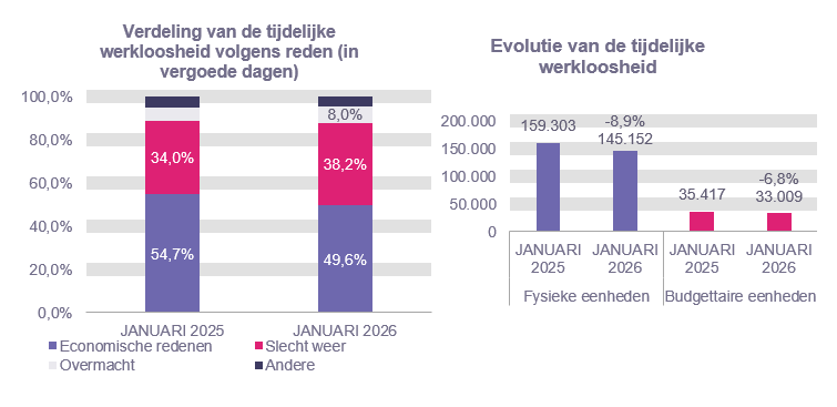 De tijdelijke werkloosheid ten slotte neemt op jaarbasis af met 14.151 eenheden of 8,9%. Het aantal werknemers in tijdelijke werkloosheid komt in januari 2026 op 145.152 fysieke eenheden, wat overeenkomt met 33.009 budgettaire eenheden rekening houdend met het beperkte aantal dagen van werkloosheid in de loop van de maand.