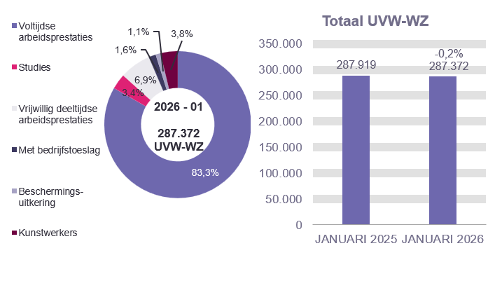 De 287.372 UVW-WZ van januari 2026 worden als volgt verdeeld: 239.306 UVW-WZ toegelaten op basis van voltijdse arbeidsprestaties, 9.813 toegelaten op basis van studies, 19.716 UVW-WZ toegelaten op basis van vrijwillig deeltijdse arbeid, 4.570 UVW-WZ met bedrijfstoeslag, 3.049 beschermingsuitkeringen en 10.918 kunstwerkers.