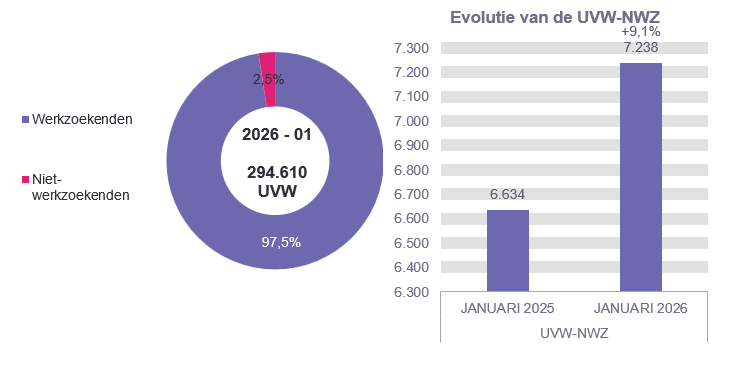 In januari 2026 hebben 287.372 uitkeringsgerechtigde volledig werkloze werkzoekenden (UVW-WZ) een uitkering ontvangen. Dat zijn er 547 minder dan in januari 2025 (-0,2%). Die daling contrasteert met de stijgingen die we de voorbije maanden zagen. Voor 17.662 personen met een einddatum van hun recht in januari, is voorlopig geen betaling meer verricht. Dat wijst erop dat zij in januari zijn uitgestroomd omdat hun recht uitgeput is. Dat aantal kan in de komende maanden nog wijzigen als ze een latere betalingsaanvraag voor januari indienen op basis van gebeurtenissen die hun recht verlengen of uitbreiden. De RVA voorziet in het voorjaar van 2026 een monitoringsdocument waarin die populatie wordt opgevolgd en de cijfers regelmatig zullen worden aangevuld en geactualiseerd.