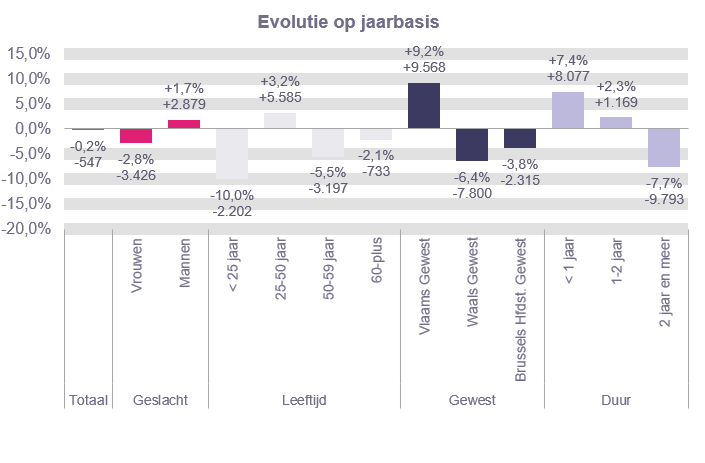 De volledige werkloosheid van korte duur (< 1 jaar) neemt toe op jaarbasis met 8.077 eenheden (+7,4%), net zoals die van 1 tot 2 jaar: +1.169 eenheden (+2,3%). De langdurige werkloosheid (2 jaar en meer) daalt met 9.793 eenheden (-7,7%).