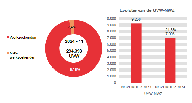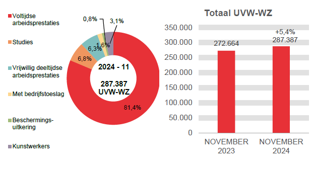 In november 2024 hebben 287.387 uitkeringsgerechtigde volledig werkloze werkzoekenden (UVW-WZ) een uitkering ontvangen, d.i. 14.723 meer dan in november 2023 (+5,4%). Zij worden als volgt verdeeld: 233.818 UVW-WZ toegelaten op basis van voltijdse arbeidsprestaties, 19.457 toegelaten op basis van studies, 18.111 UVW-WZ toegelaten op basis van vrijwillig deeltijdse arbeid, 4.697 UVW-WZ met bedrijfstoeslag, 2.394 beschermingsuitkeringen en 8.910 kunstwerkers.