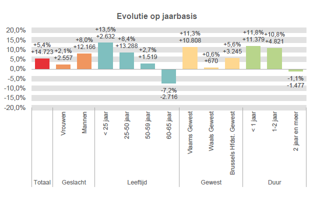 De volledige werkloosheid van korte duur (< 1 jaar) neemt toe op jaarbasis met 11.379 eenheden (+11,8%), net zoals die van 1 tot 2 jaar: +4.821 eenheden (+10,8%). De langdurige werkloosheid (2 jaar en meer) daalt met 1.477 eenheden (-1,1%).