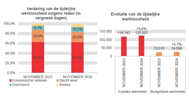 De tijdelijke werkloosheid ten slotte neemt op jaarbasis toe met 6.665 eenheden of 5,6%. Het aantal werknemers in tijdelijke werkloosheid komt in november 2024 op 125.007 fysieke eenheden, wat overeenkomt met 24.090 budgettaire eenheden rekening houdend met het beperkte aantal dagen van werkloosheid in de loop van de maand.