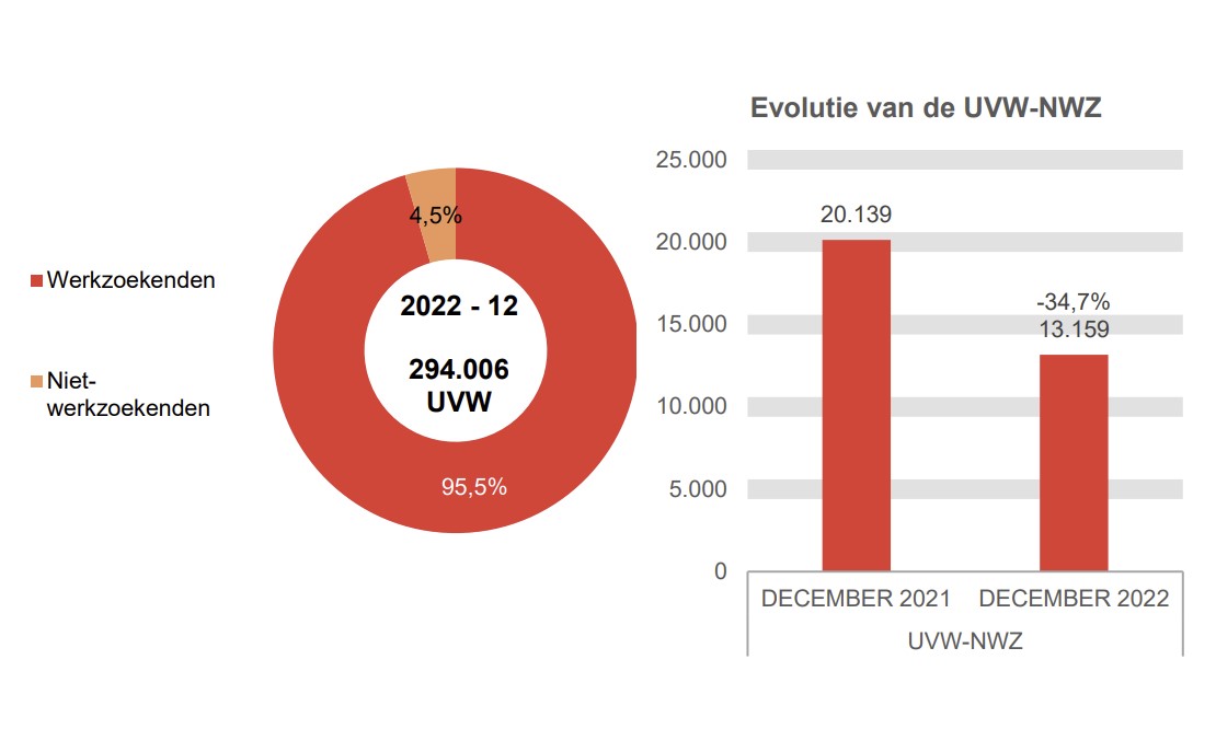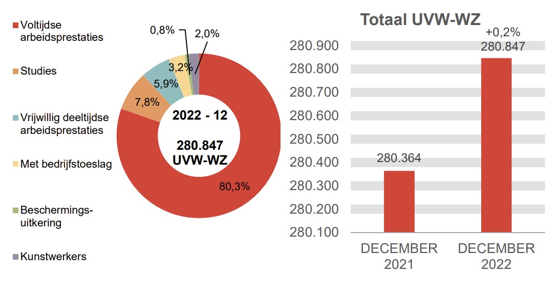 In december 2022 hebben 280.847 uitkeringsgerechtigde volledig werkloze werkzoekenden (UVW-WZ) een uitkering ontvangen, d.i. 483 meer dan in december 2021 (+0,2%). Zij worden als volgt verdeeld: 225.628 UVW-WZ toegelaten op basis van voltijdse arbeidsprestaties, 22.015 toegelaten op basis van studies, 16.500 UVW-WZ toegelaten op basis van vrijwillig deeltijdse arbeid, 8.916 UVW-WZ met bedrijfstoeslag, 2.119 beschermingsuitkeringen en 5.669 kunstwerkers.