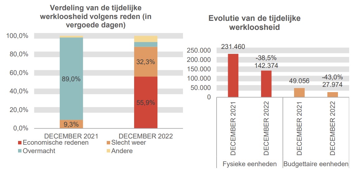 De tijdelijke werkloosheid ten slotte neemt op jaarbasis af met 89.086 eenheden of 38,5%. Het aantal werknemers in tijdelijke werkloosheid komt in december 2022 op 142.374 fysieke eenheden, wat overeenkomt met 27.974 budgettaire eenheden rekening houdend met het beperkte aantal dagen van werkloosheid in de loop van de maand.
