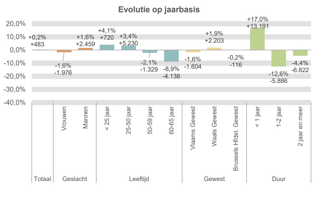 De volledige werkloosheid van korte duur (< 1 jaar) neemt toe op jaarbasis met 13.191 eenheden (+17,0%), maar die van 1 tot 2 jaar daalt: -5.886 eenheden (-12,6%). De langdurige werkloosheid (2 jaar en meer) daalt met 6.822 eenheden (-4,4%).