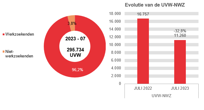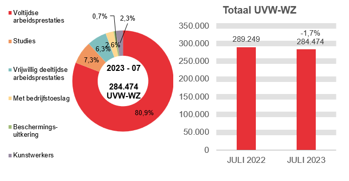 In juli 2023 hebben 284.474 uitkeringsgerechtigde volledig werkloze werkzoekenden (UVW-WZ) een uitkering ontvangen, d.i. 4.775 minder dan in juli 2022 (-1,7%). Zij worden als volgt verdeeld: 230.137 UVW-WZ toegelaten op basis van voltijdse arbeidsprestaties, 20.778 toegelaten op basis van studies, 17.789 UVW-WZ toegelaten op basis van vrijwillig deeltijdse arbeid, 7.283 UVW-WZ met bedrijfstoeslag, 2.081 beschermingsuitkeringen en 6.406 kunstwerkers.