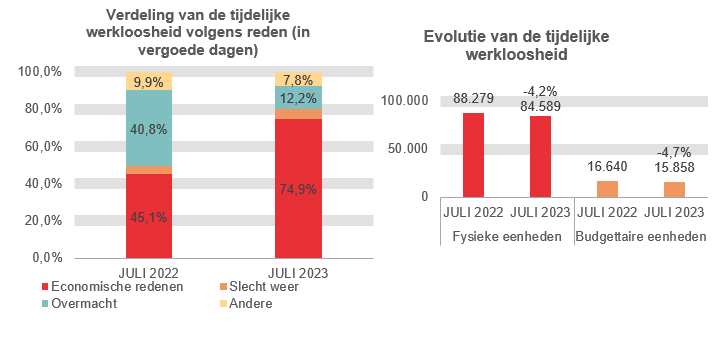 De tijdelijke werkloosheid ten slotte neemt op jaarbasis af met 3.690 eenheden of 4,2%. Het aantal werknemers in tijdelijke werkloosheid komt in juli 2023 op 84.589 fysieke eenheden, wat overeenkomt met 15.858 budgettaire eenheden rekening houdend met het beperkte aantal dagen van werkloosheid in de loop van de maand.