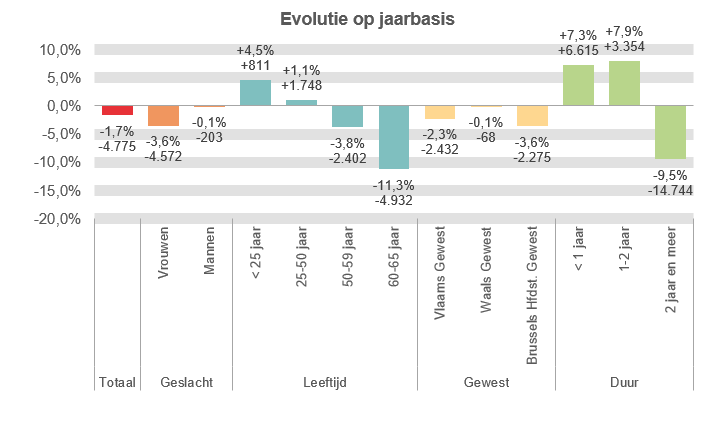 De volledige werkloosheid van korte duur (< 1 jaar) neemt toe op jaarbasis met 6.615 eenheden (+7,3%), net zoals die van 1 tot 2 jaar: +3.354 eenheden (+7,9%). De langdurige werkloosheid (2 jaar en meer) daalt met 14.744 eenheden (-9,5%).