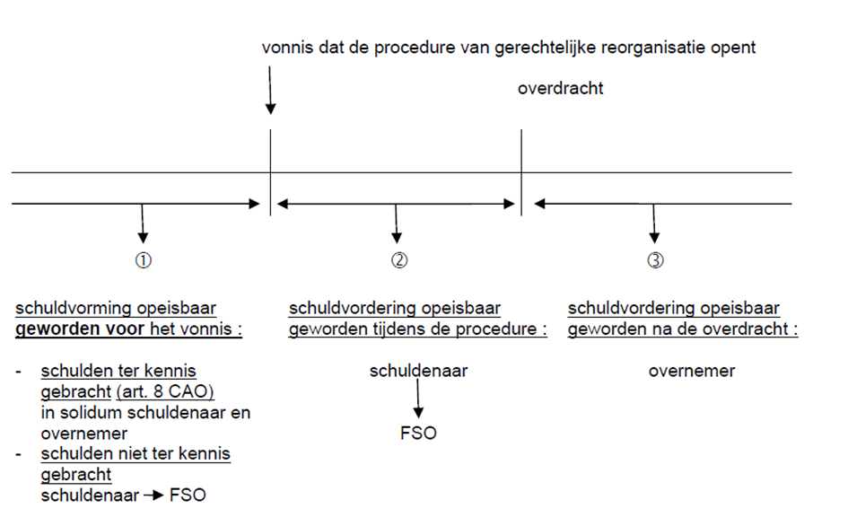 “De schulden die opeisbaar worden na het tijdstip van het vonnis dat de procedure van gerechtelijke reorganisatie [of van overdracht onder gerechtelijk gezag] opent, of, bij ontstentenis van dit vonnis, na het tijdstip van het vonnis dat de overdracht onder gerechtelijk gezag beveelt maar vóór het tijdstip van de overdracht onder gerechtelijk gezag en die voortvloeien uit de arbeidsovereenkomst tussen de schuldenaar en de werknemers die overgenomen zullen worden, blijven ten laste van de schuldenaar.”