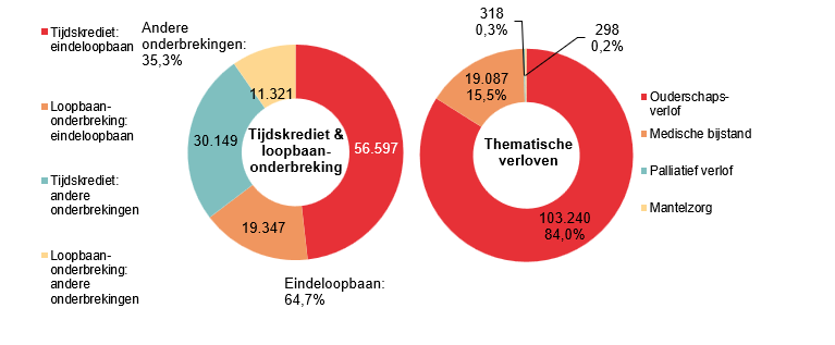 Bijna 2/3 van de uitkeringen in het kader van tijdskrediet en loopbaanonderbreking (75.944 eenheden, d.i. 64,7%) betreffen het eindeloopbaanstelsel, waarmee oudere werknemers vóór hun pensioen hun werkregime lichter maken teneinde langer tewerkgesteld te kunnen blijven. De thematische verloven betreffen voor meer dan 4/5 het ouderschapsverlof (103.240 eenheden, d.i. 84,0%).