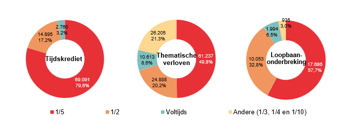 Het aantal voltijdse onderbrekingen is daarentegen vrij beperkt: het gaat om 15.367 of 6,4% van de gevallen (2.760 of 3,2% bij het tijdskrediet, 10.613 of 8,6% bij de thematische verloven en 1.994 of 6,5% bij de loopbaanonderbreking).
