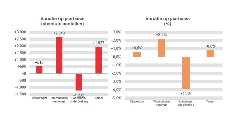 Daling bij de loopbaanonderbreking, stijgingen bij het tijdskrediet en de thematische verloven