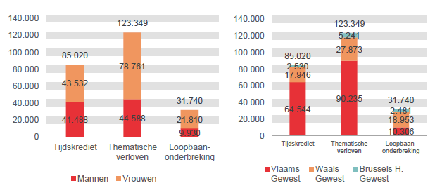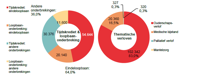 Bijna 2/3 van de uitkeringen in het kader van tijdskrediet en loopbaanonderbreking (74.784 eenheden, d.i. 64,0%) betreffen het eindeloopbaanstelsel, waarmee oudere werknemers vóór hun pensioen hun werkregime lichter maken teneinde langer tewerkgesteld te kunnen blijven. De thematische verloven betreffen voor meer dan 4/5 het ouderschapsverlof (102.342 eenheden, d.i. 83,0%).