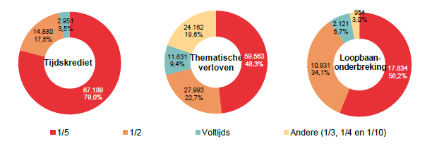 Het aantal voltijdse onderbrekingen is daarentegen vrij beperkt: het gaat om 16.703 of 7,0% van de gevallen (2.951 of 3,5% bij het tijdskrediet, 11.631 of 9,4% bij de thematische verloven en 2.121 of 6,7% bij de loopbaanonderbreking).