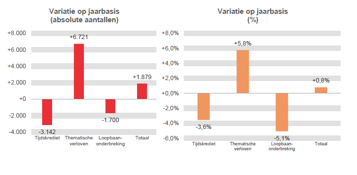 Dalingen bij het tijdskrediet en de loopbaanonderbreking, stijging bij de thematische verloven