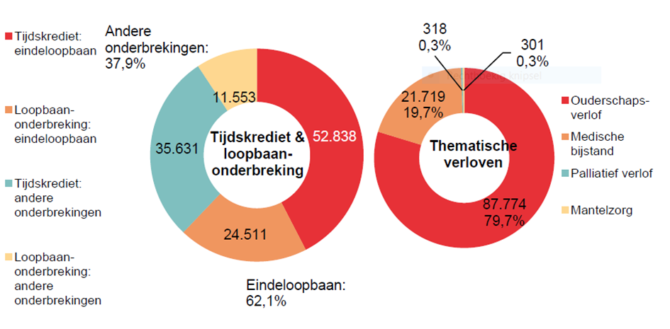 Bijna 2/3 van de uitkeringen in het kader van tijdskrediet en loopbaanonderbreking (77.349 eenheden, d.i. 62,1%) betreffen het eindeloopbaanstelsel, waarmee oudere werknemers vóór hun pensioen hun werkregime lichter maken teneinde langer tewerkgesteld te kunnen blijven. De thematische verloven betreffen voor ongeveer 4/5 het ouderschapsverlof (87.774 eenheden, d.i. 79,7%). Het thematisch verlof voor mantelzorgers, dat vanaf september 2020 in werking trad, betreft 301 eenheden.
