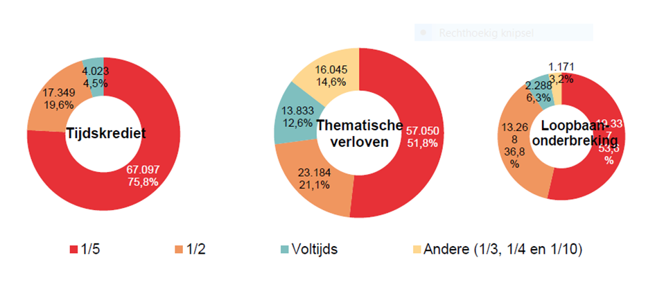 Het aantal voltijdse onderbrekingen is daarentegen vrij beperkt: het gaat om 20.144 of 8,6% van de gevallen (4.023 of 4,5% bij het tijdskrediet, 13.833 of 12,6% bij de thematische verloven en 2.288 of 6,3% bij de loopbaanonderbreking).