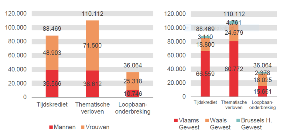 Vooral vrouwen nemen tijdskrediet, thematisch verlof of loopbaanonderbreking. In september 2022 ging het om 145.721 vrouwelijke uitkeringstrekkers (62,1%) tegenover 88.924 mannelijke (37,9%). Verder wordt vooral in het Vlaams Gewest gebruik gemaakt van tijdskrediet, thematische verloven en loopbaanonderbreking: in september 2022 gaat het om 162.992 uitkeringstrekkers (69,5%) tegenover 61.404 in het Waals en 10.249 in het Brussels Hoofdstedelijk Gewest (respectievelijk 26,2% en 4,4%).