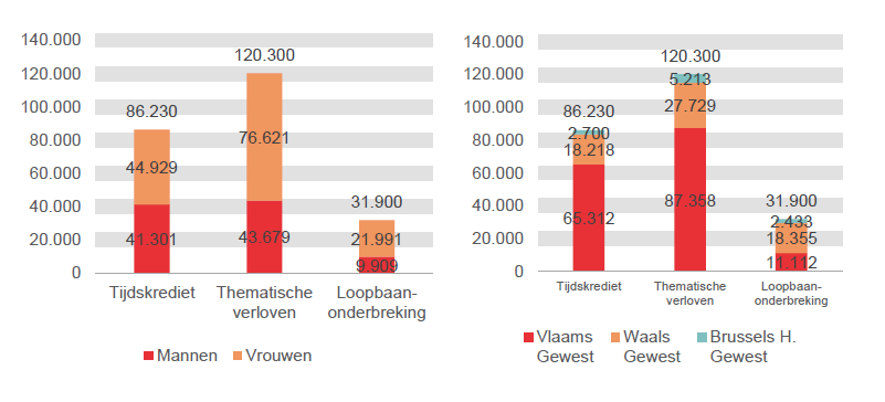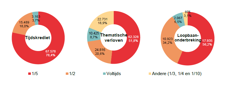 Het aantal voltijdse onderbrekingen is daarentegen vrij beperkt: het gaat om 15.655 of 6,6% van de gevallen (3.163 of 3,7% bij het tijdskrediet, 10.425 of 8,7% bij de thematische verloven en 2.067 of 6,5% bij de loopbaanonderbreking).