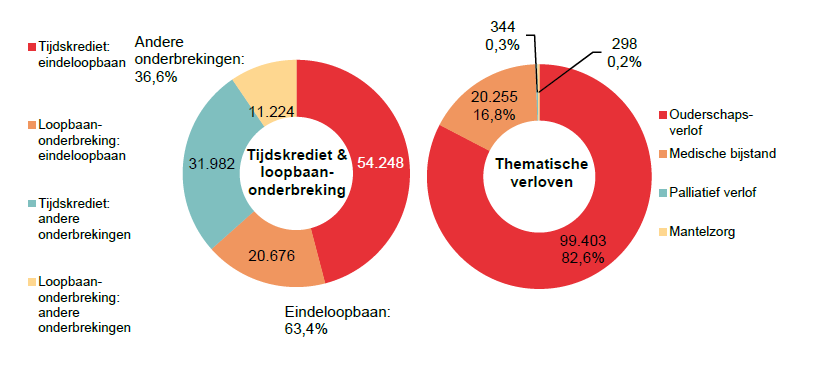 Bijna 2/3 van de uitkeringen in het kader van tijdskrediet en loopbaanonderbreking (74.924 eenheden, d.i. 63,4%) betreffen het eindeloopbaanstelsel, waarmee oudere werknemers vóór hun pensioen hun werkregime lichter maken teneinde langer tewerkgesteld te kunnen blijven. De thematische verloven betreffen voor meer dan 4/5 het ouderschapsverlof (99.403 eenheden, d.i. 82,6%).