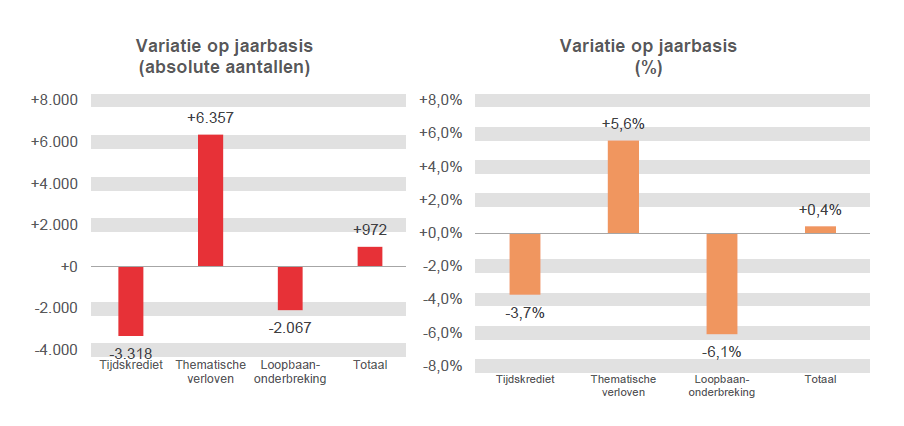 Dalingen bij het tijdskrediet en de loopbaanonderbreking, stijging bij de thematische verloven