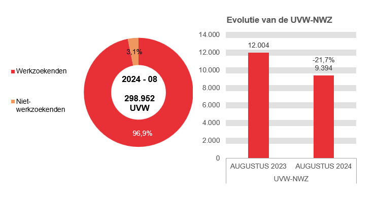 In augustus 2024 hebben 289.558 uitkeringsgerechtigde volledig werkloze werkzoekenden (UVW-WZ) een uitkering ontvangen, d.i. 5.853 meer dan in augustus 2023 (+2,1%). Zij worden als volgt verdeeld: 234.907 UVW-WZ toegelaten op basis van voltijdse arbeidsprestaties, 20.139 toegelaten op basis van studies, 18.694 UVW-WZ toegelaten op basis van vrijwillig deeltijdse arbeid, 5.031 UVW-WZ met bedrijfstoeslag, 2.141 beschermingsuitkeringen en 8.646 kunstwerkers.