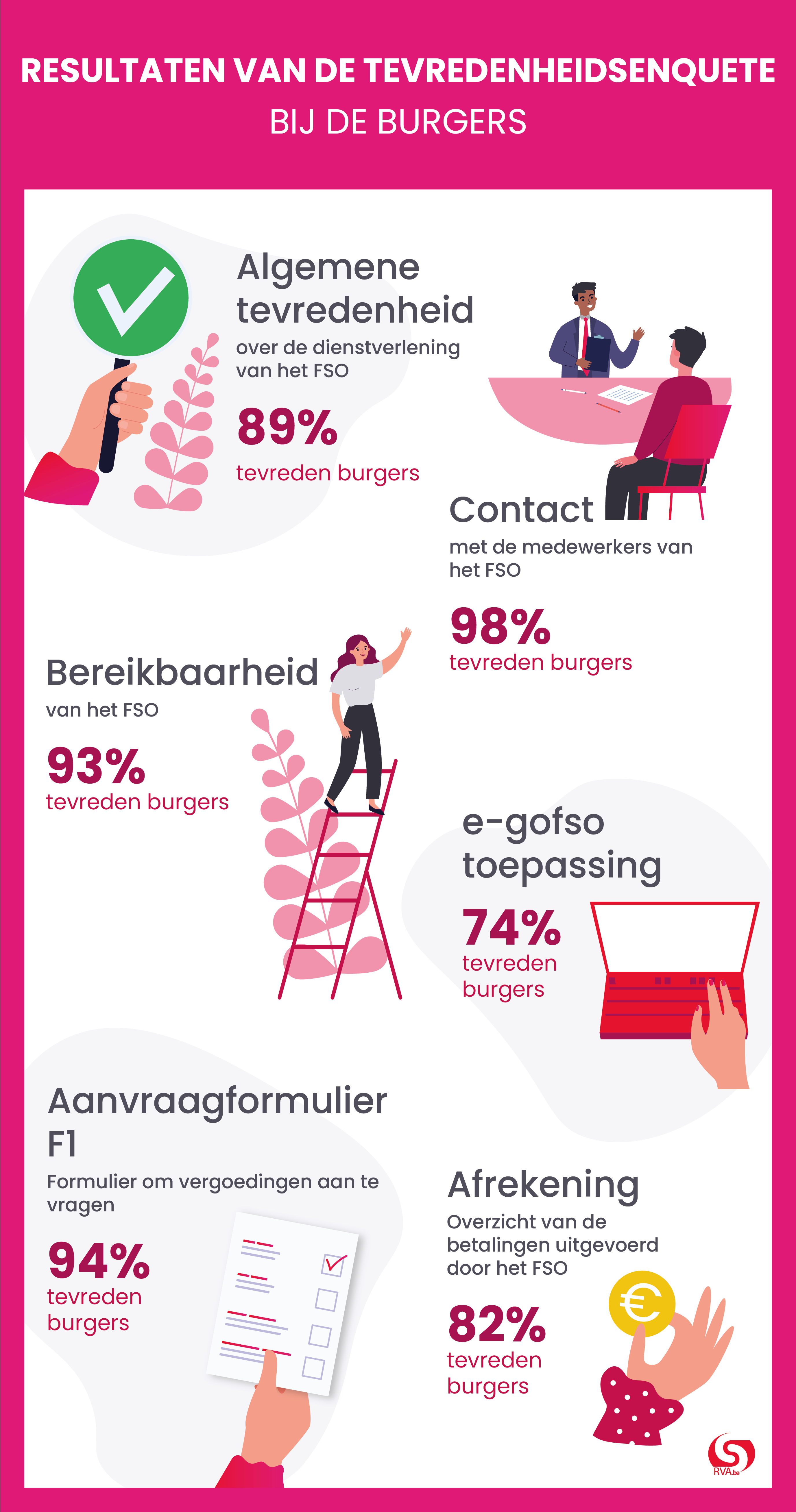 - Algemene tevredenheid over de dienstverlening van het FSO: 89% tevreden burgers