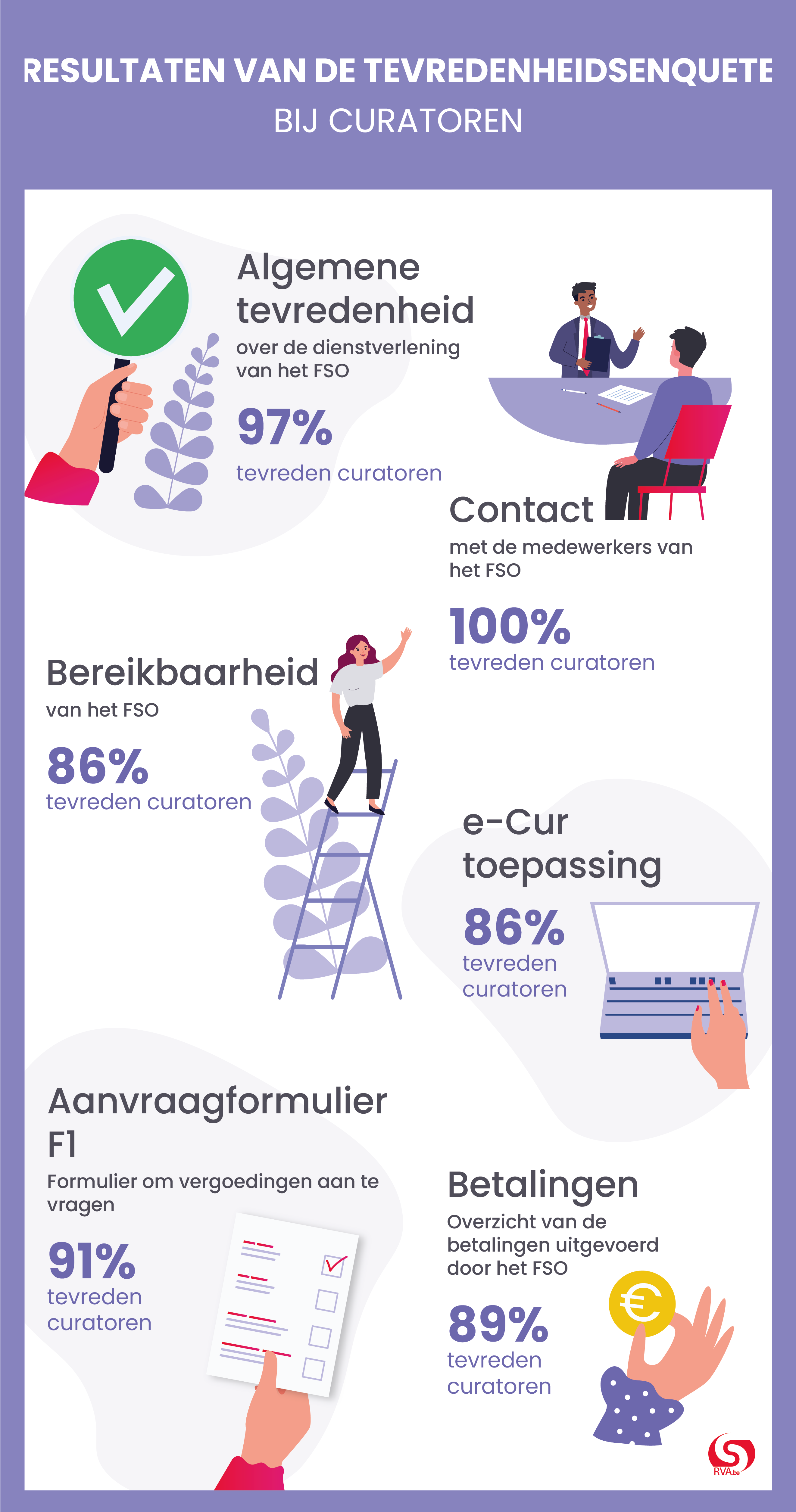 - Algemene tevredenheid over de dienstverlening van het FSO: 97% tevreden curatoren