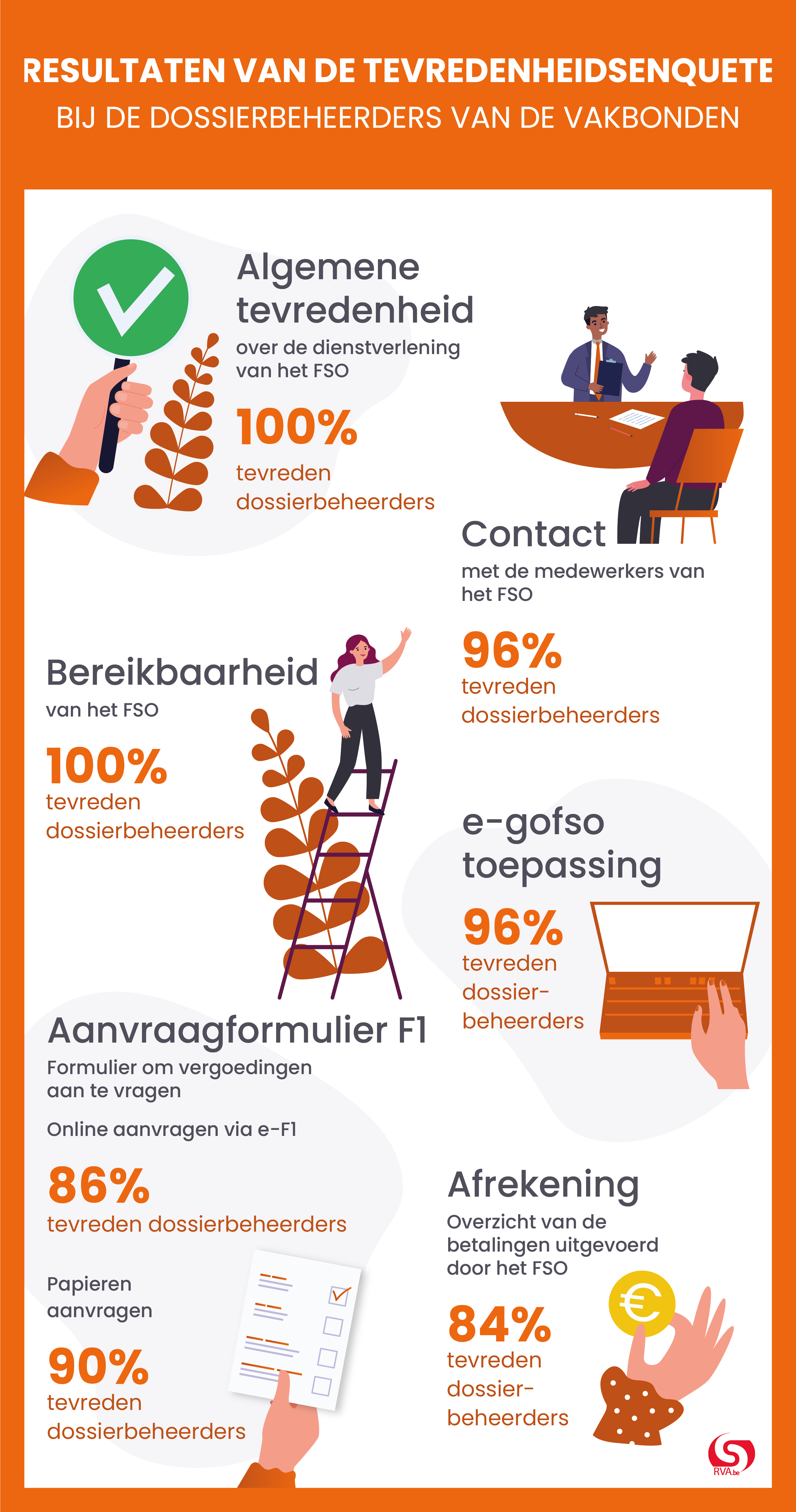 - Algemene tevredenheid over de dienstverlening van het FSO: 100% tevreden dossierbeheerders