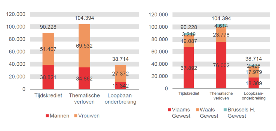 Vooral vrouwen nemen tijdskrediet, thematisch verlof of loopbaanonderbreking. In februari 2022 ging het om 148.311 vrouwelijke uitkeringstrekkers (63,6%) tegenover 85.025 mannelijke (36,4%). Verder wordt vooral in het Vlaams Gewest gebruik gemaakt van tijdskrediet, thematische verloven en loopbaanonderbreking: in februari 2022 gaat het om 162.203 uitkeringstrekkers (69,5%) tegenover 60.844 in het Waals en 10.289 in het Brussels Hoofdstedelijk Gewest (respectievelijk 26,1% en 4,4%).