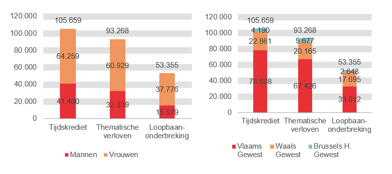 Vooral vrouwen nemen tijdskrediet, thematisch verlof of loopbaanonderbreking. In juli 2019 ging het om 162.964 vrouwelijke uitkeringstrekkers (64,6%) tegenover 89.318 mannelijke (35,4%). Verder wordt vooral in het Vlaams Gewest gebruik gemaakt van tijdskrediet, thematische verloven en loopbaanonderbreking: in juli 2019 gaat het om 179.046 uitkeringstrekkers (71,0%) tegenover 60.721 in het Waals en 12.515 in het Brussels Hoofdstedelijk Gewest (respectievelijk 24,1% en 5,0%).