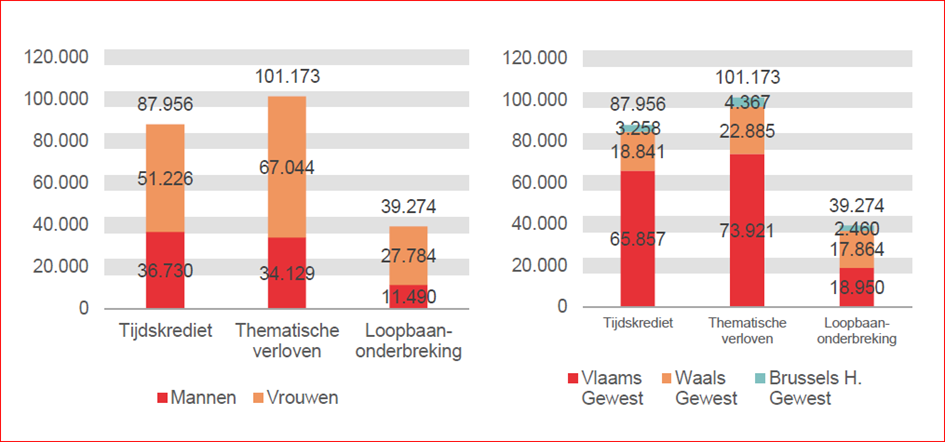 Vooral vrouwen nemen tijdskrediet, thematisch verlof of loopbaanonderbreking. In november 2021 ging het om 146.054 vrouwelijke uitkeringstrekkers (63,9%) tegenover 82.349 mannelijke (36,1%). Verder wordt vooral in het Vlaams Gewest gebruik gemaakt van tijdskrediet, thematische verloven en loopbaanonderbreking: in november 2021 gaat het om 158.728 uitkeringstrekkers (69,5%) tegenover 59.590 in het Waals en 10.085 in het Brussels Hoofdstedelijk Gewest (respectievelijk 26,1% en 4,4%).