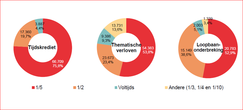 Het aantal voltijdse onderbrekingen is daarentegen vrij beperkt: het gaat om 15.276 of 6,7% van de gevallen (3.887 of 4,4% bij het tijdskrediet, 9.386 of 9,3% bij de thematische verloven en 2.003 of 5,1% bij de loopbaanonderbreking).
