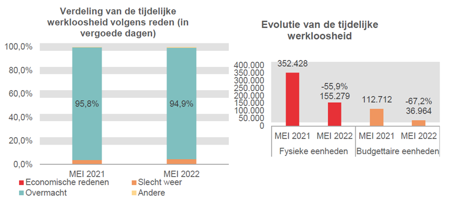 De tijdelijke werkloosheid ten slotte neemt op jaarbasis af met 197.149 eenheden of 55,9%. Het aantal werknemers in tijdelijke werkloosheid komt in mei 2022 op 155.279 fysieke eenheden, wat overeenkomt met 36.964 budgettaire eenheden rekening houdend met het beperkte aantal dagen van werkloosheid in de loop van de maand.