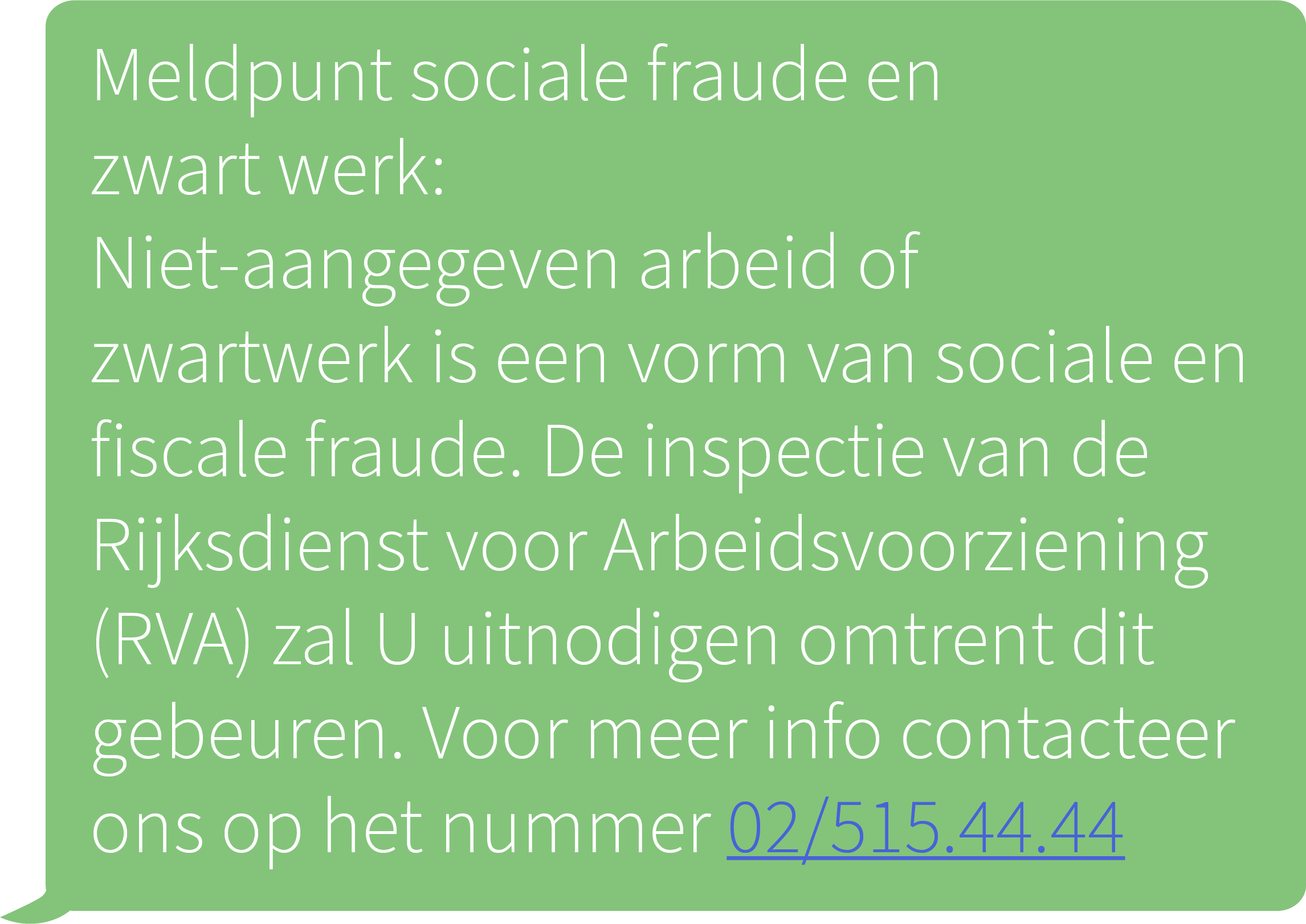 "Meldpunt sociale fraude en zwart werk: Niet-aangegeven arbeid of zwartwerk is een vorm van sociale en fiscale fraude. De inspectie van de Rijksdienst voor Arbeidsviirziening (RVA) zal U uitnodigen omtrent dit gebeuren. Voor meer info contacteer ons op het nummer 02/515.44.44."