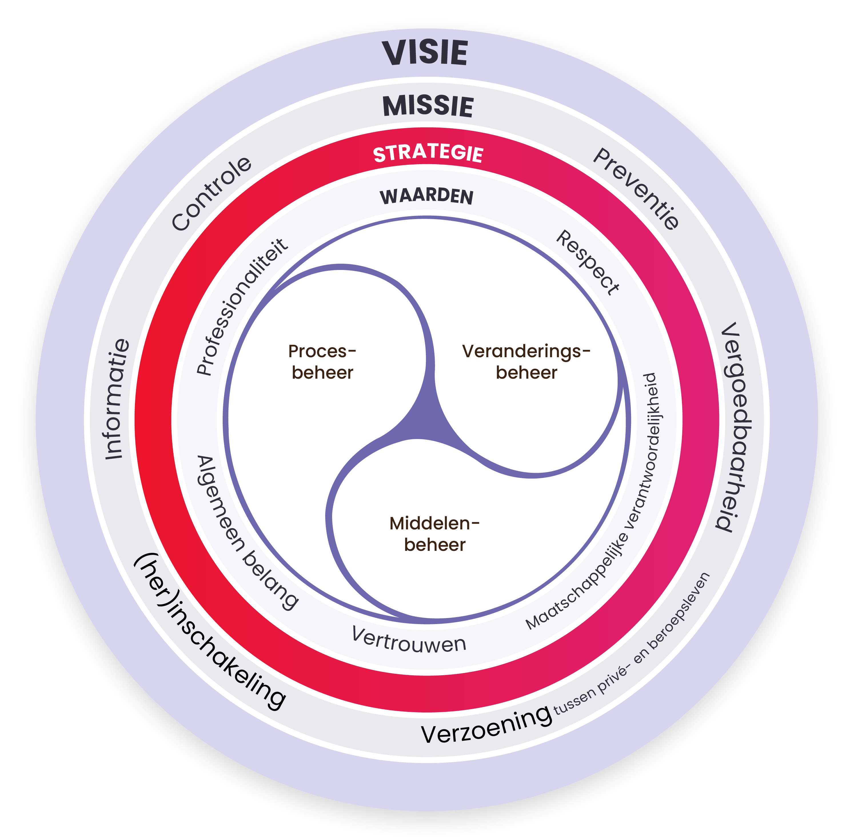 Het uitgangspunt van het model zijn de missie, visie en de waarden van de organisatie.