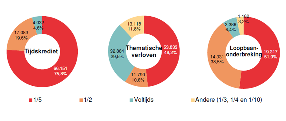 Het aantal voltijdse onderbrekingen is daarentegen vrij beperkt: het gaat om 39.302 of 16,6% van de gevallen (4.032 of 4,6% bij het tijdskrediet, 32.884 of 29,5% bij de thematische verloven en 2.386 of 6,4% bij de loopbaanonderbreking).